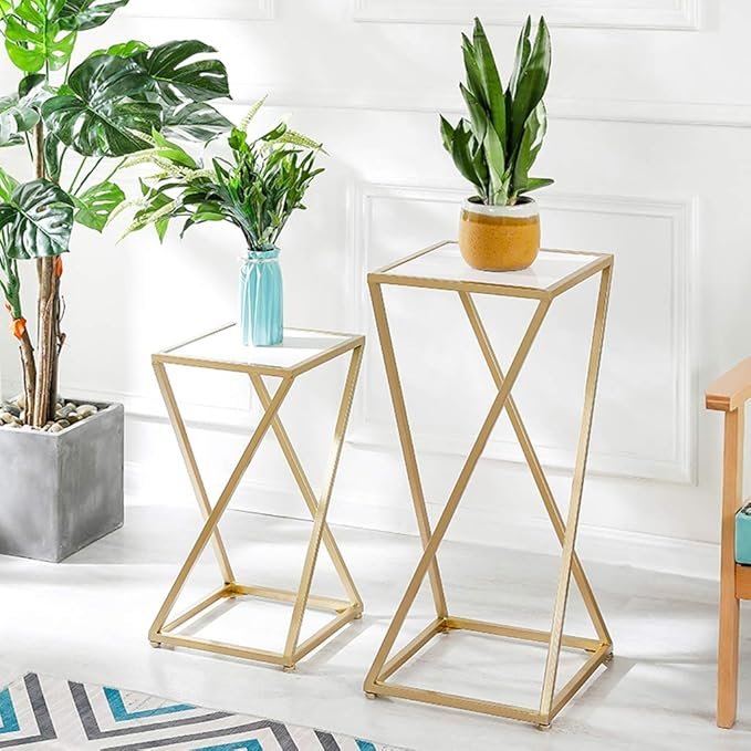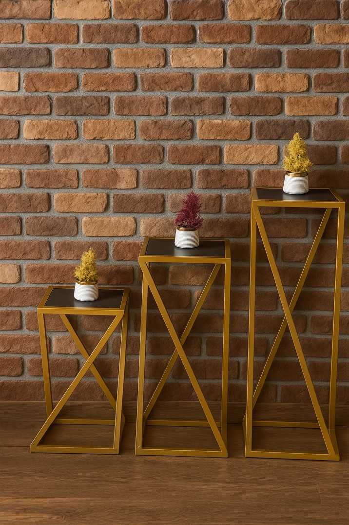 The Geometric Side Table is a set of three elegant and modern tables, each featuring a sleek black top and a sturdy golden metal frame with a unique crisscross design. Available in Golden color, this set includes varying heights to suit different decor needs, perfect for displaying plants or decor items in living rooms or hallways. Its durable construction and stylish look make it a versatile addition to any space.