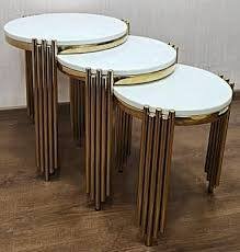The LuxeGold Trio Nesting Tables bring sophistication and style to your living space. Featuring sleek black tops and gleaming gold metal frames, this set of three tables offers both functionality and elegance. The varying sizes allow for flexible arrangement in any room, while the luxurious design makes it perfect for modern or minimalist interiors. Whether placed together or separately, these tables will add a touch of refinement to your home or office.
