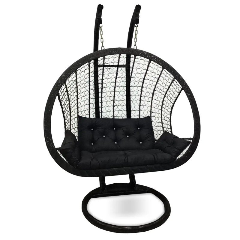 A stylish and comfortable 2-seater hanging chair with a black metal frame and plush seating, perfect for outdoor relaxation and modern spaces.