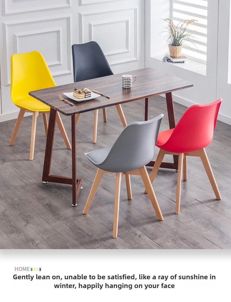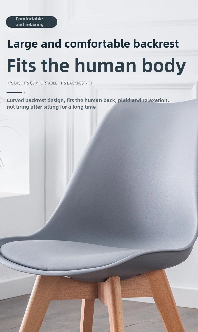 A sleek and comfortable modern dining chair with a cushioned seat and wooden legs, ideal for dining or office use. Available in White, Grey, Black, and customized colors.