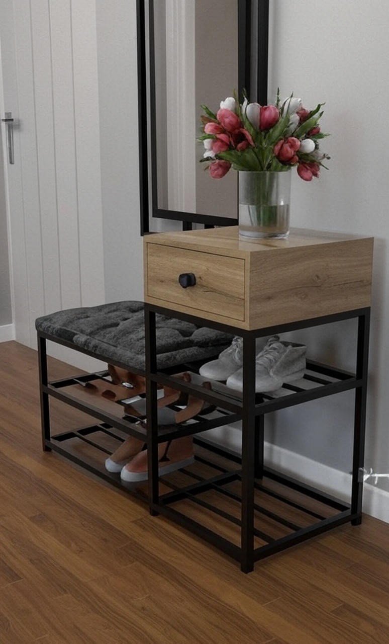 Declutter your entrance with this modern and stylish Entryway Shoe Rack with Bench and Drawer. It features a soft, tufted cushion for comfortable seating while putting on or taking off shoes. Multiple open shelves provide generous shoe storage, while the built-in wooden drawer adds a neat spot for keys, wallets, or accessories. The sturdy black metal frame offers durability and a contemporary industrial look that complements any home décor.