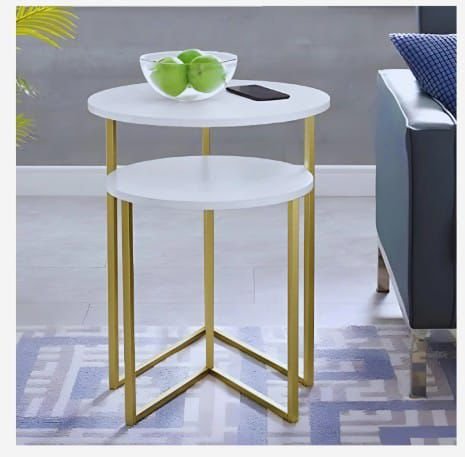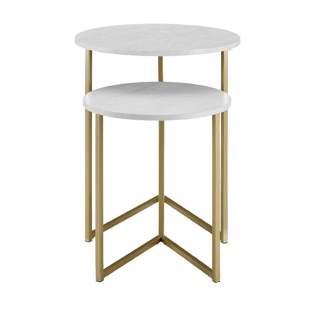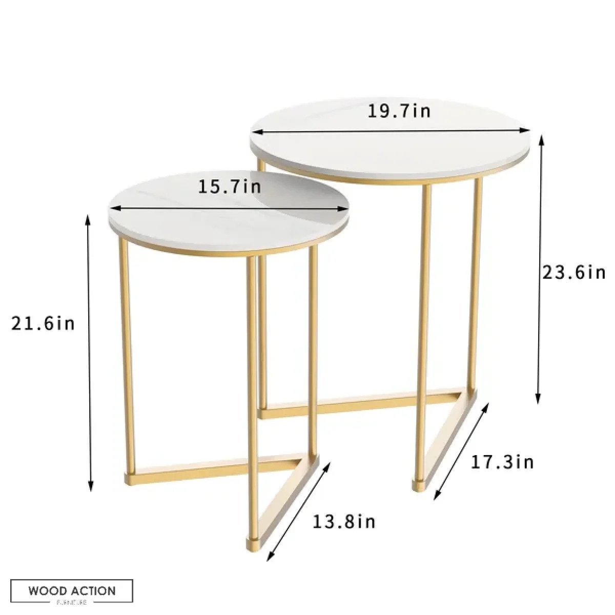 A stylish set of two modern nesting side tables with a white round top and golden metal legs—ideal for versatile and elegant living spaces.