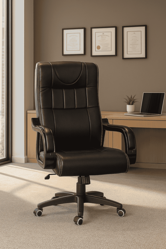 A sophisticated visitor chair with a durable plywood frame, polished wooden legs, and premium leatherette upholstery, offering extreme comfort and a classy look.