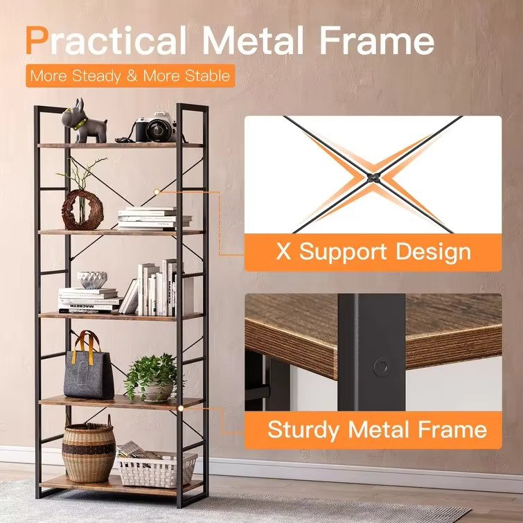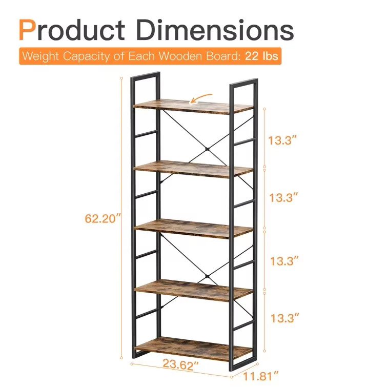 A stylish 5-tier wooden bookshelf with a sturdy metal frame, perfect for organizing books, plants, and decor items. Available in White, Black, and customized colors.